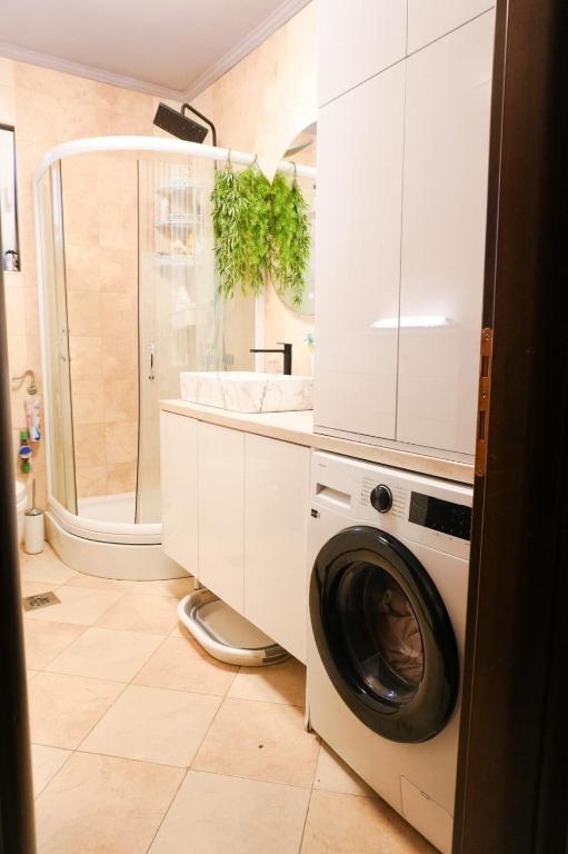 mašina za pranje veša, kuhinja, frižider, posuđe, aparat za kafu, sto za ručavanje, čaše za vino
